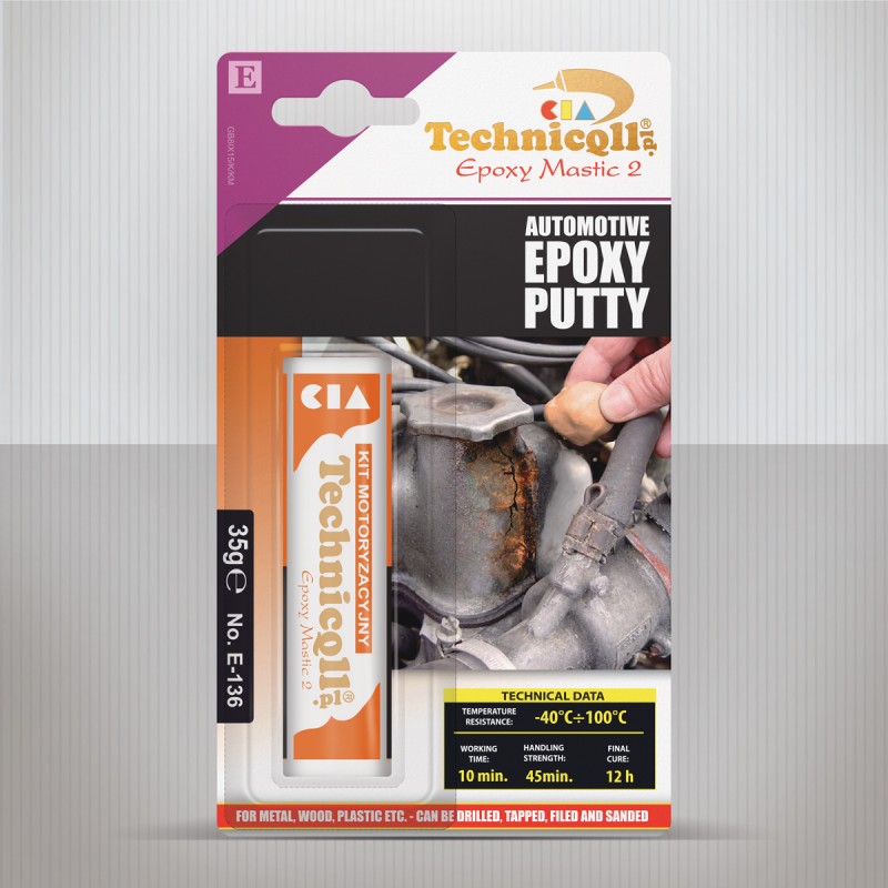 A two component putty of plasticine consistency designed for emergency car repairs without disassembly. Bonds, seals, fills in losses in all materials: metals (e.g. aluminium, cast iron, steel), plastics (e.g. PVC, Plexiglass), glass, wood, stone and so on. Resistant to vibrations, aggresive chemical agents e.g. petrol.