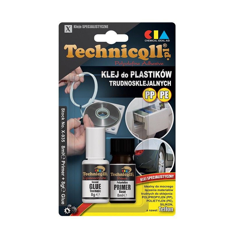 A specialistic adhesive with a ground agent called BASE PRIMER increasing surface energy of plastics difficult to stick such as: PP (Polypropylene), PE (Polyethylene), PTFE. This colourless, curing in seconds and close to ideal of the 21st century adhesive is used for strong and durable bonding of all materials having surfaces smooth and porous, stiff and elastic as well as material combinations e.g. PE to steel, PP to stone. It bonds to polyethylene and polypropylene, hot formed elastomers, silicone and related plastics. May be also used for bonding PTFE plastics to all other materials e.g. PE to glass or stone or PVC etc.In the production of the adhesive the latest achievement of supermolecular chemical engineering has been used up. Applying a new generation adhesive allows for obtaining excellent strength parameters and the highest adhesion to polyolefins (PE, PP) coated previous with the base primer.