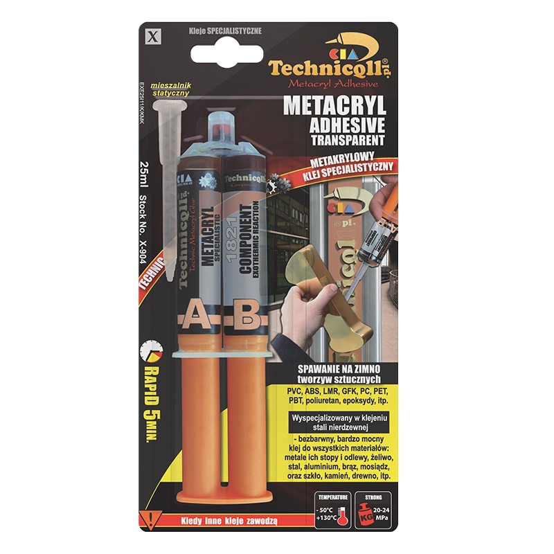 Designed for very quick bonding all hard soft and thermoplastic plastics! PVC, ABS, LMR, GFK, PC, PET, ABT acrylate (PMMA), polyurethane, epoxide, composite. Indispensable in durable and very strong bonding stainless steel (gives tensile strength up to 300kg/cm2) as well as other metals and their alloys, cast iron, iron, aluminium, copper, bronze, zinc, chromium and plated steel. Very good for bonding stone, ceramics, glass, wood, coal, ferrite etc, Universal, may be used to bond various materials even the most difficult for sticking except polyolefins (PP, PE, PTFE).